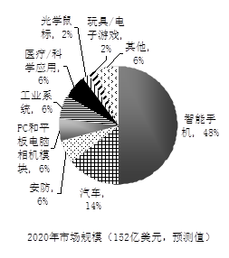 IC Insights表示,過去的增長主要基于智能手機和數碼相機對CMOS圖像傳感器的采用,但現在及以后的增長則主要擴大到汽車、安全和醫療應用。汽車以后很可能會需要幾個甚至更多的圖像傳感器用于觀察行人,注意外面可能發生的事故或錄制撞車等其他事故的視頻。預計汽車系統將成為CMOS圖像傳感器增長最快的應用,未來5年全球銷售將以55%的年均復合增長率發展,到2020年市場規模達22億美元(占2020年CMOS圖像傳感器市場規模的14%)。緊隨汽車之后的是安防(以36%的年均復合增長率增長到9.12億美元)、醫療/科學應用(以34%的年均復合增長率增長到8.67億美元)、玩具/電子游戲(以32%的年均復合增長率增長到2.74億美元)和工業系統(以18%的年均復合增長率增長到8.97億美元)。同時,CMOS圖像傳感器領先應用的智能手機預計將以1%的年均復合增長率到2020年達到73億美元(市場占比為48%)。用于PC和平板電腦的相機模塊中的CMOS圖像傳感器預計會以6%的年均復合增長率發展到2020年的9.73億美元,而用于獨立數碼相機的傳感器銷售預計在未來5年達到6.23億美元(圖5)。