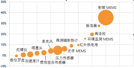 圖4 2017—2022年不同MEMS器件的復合年均增長率及市場規模(單位:億美元)