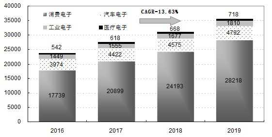 圖1 2016-2019年全球四大應用領域的智能傳感器市場規模(百萬美元)